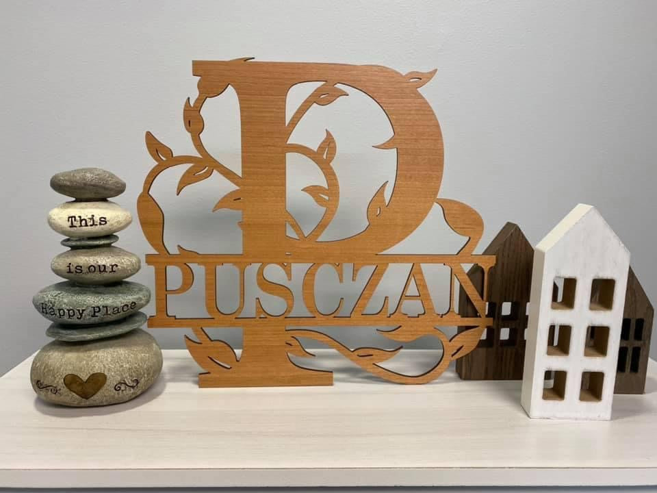 Add a unique custom touch to your decor, or great as a gift! 11" tall, 1/4" thick, width varies by letter/name. Available in cherry or maple, in traditional or vine patterns.